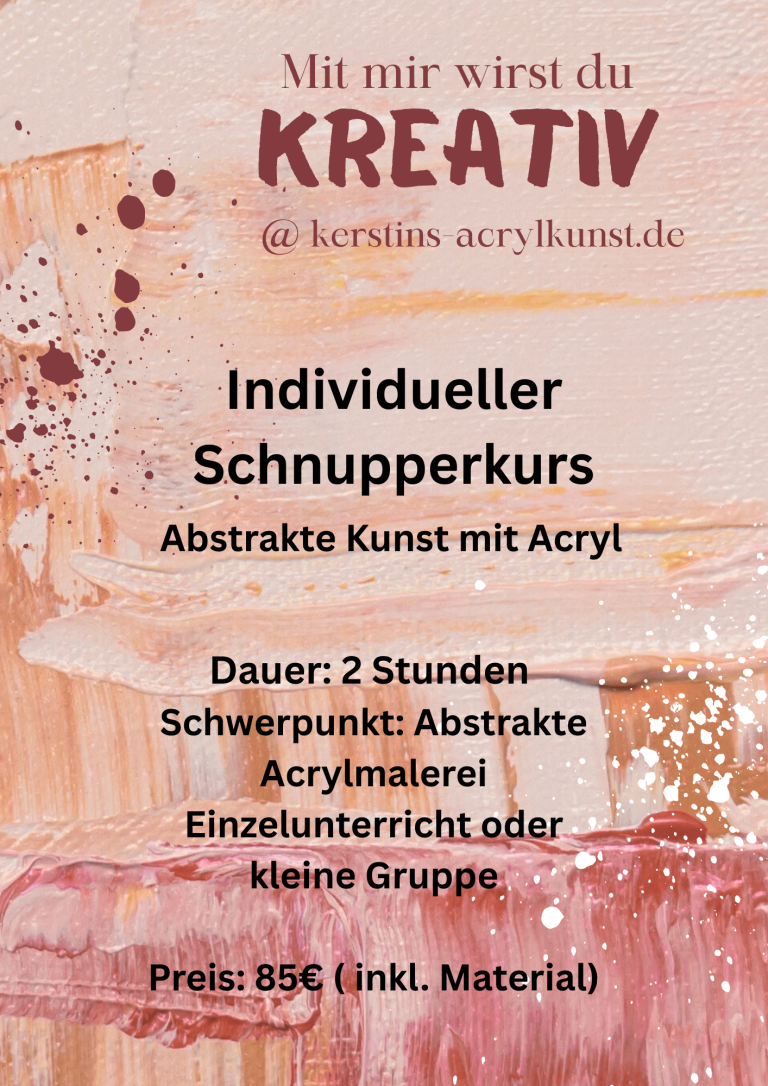 Wenn du spüren möchtest, wie wohltuend schöpferische Energie wirkt, lade ich dich herzlich zu meinem Schnupperkurs für abstrakte Kunst ein. Dort kannst du in entspannter Atmosphäre selbst erleben, wie Malen neue Perspektiven öffnet, innere Ruhe schenkt und Räume verwandelt.