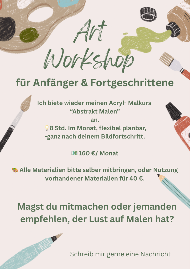 Wenn du spüren möchtest, wie wohltuend schöpferische Energie wirkt, lade ich dich herzlich zu meinem Schnupperkurs für abstrakte Kunst ein. Dort kannst du in entspannter Atmosphäre selbst erleben, wie Malen neue Perspektiven öffnet, innere Ruhe schenkt und Räume verwandelt.